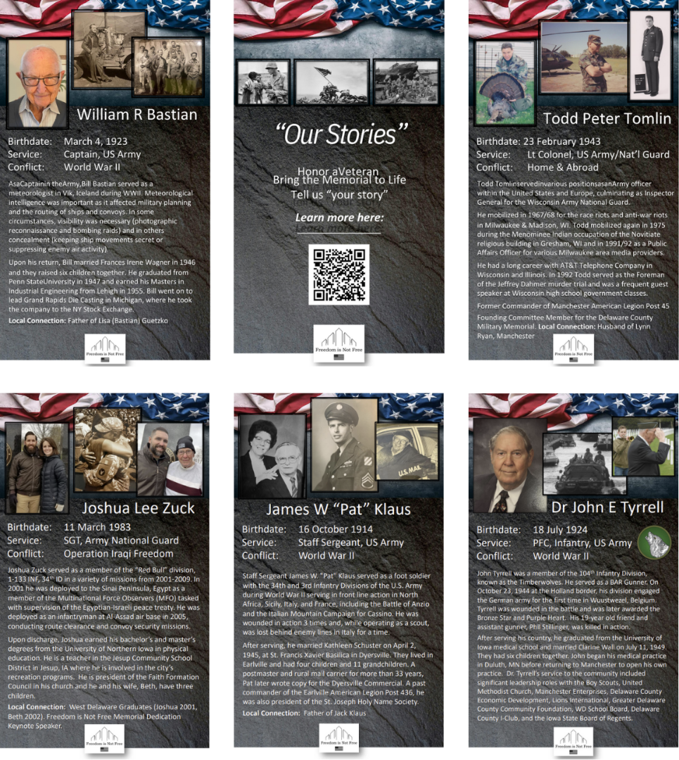 Located at Baum Park in Manchester, IA, the Freedom is not Free Memorial is a testimonial honoring the courage, service and bravery of our service men and women in our community and across the nation.